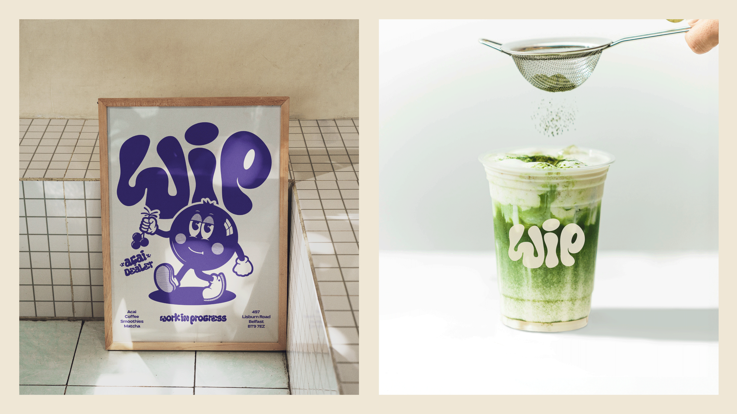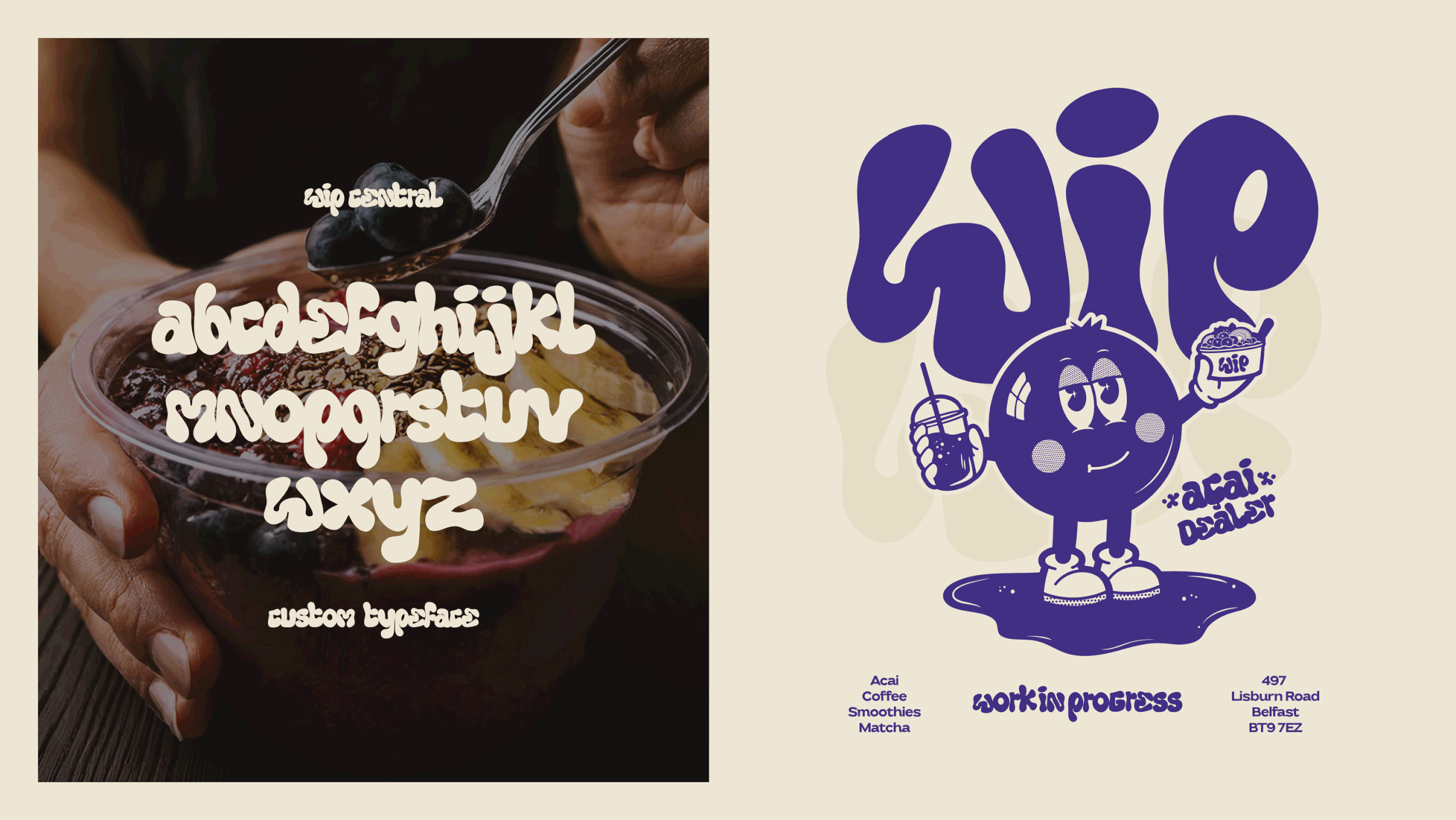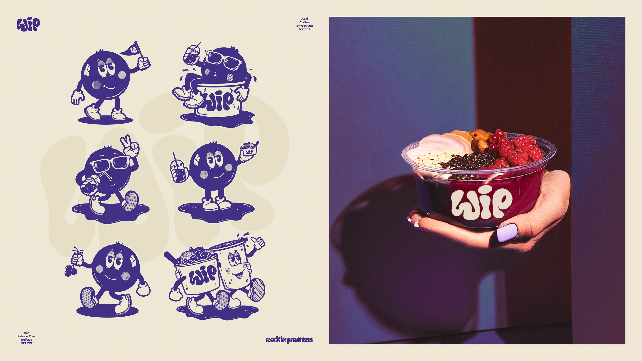 WIP is officially the hottest açaí joint to hit Belfast. Slinging stacked bowls, killer coffee, and matcha that’ll make you feel like you’ve got your life together, they needed a brand with enough personality to keep up. So we got to work: a hand-drawn logo with plenty of swagger, a custom typeface to match and a whole crew of açaí mascots and mischief-making characters. Along the way, we cooked up some snappy slogans and turned them into bold lock-ups to pull everything together into one loud, confident, unmistakeably-WIP package.